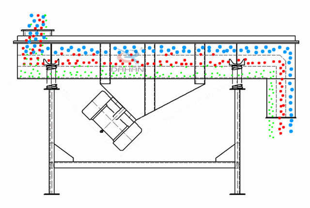 原理是利用振動電機激振器作為振動源,使物料在篩網上被拋起,同時向前作直線運動,物料從給料機均勻地進入篩分機的進料口,通過多層篩網產生數(shù)種規(guī)格的篩上物、篩下物、分別從各自的出口排出。