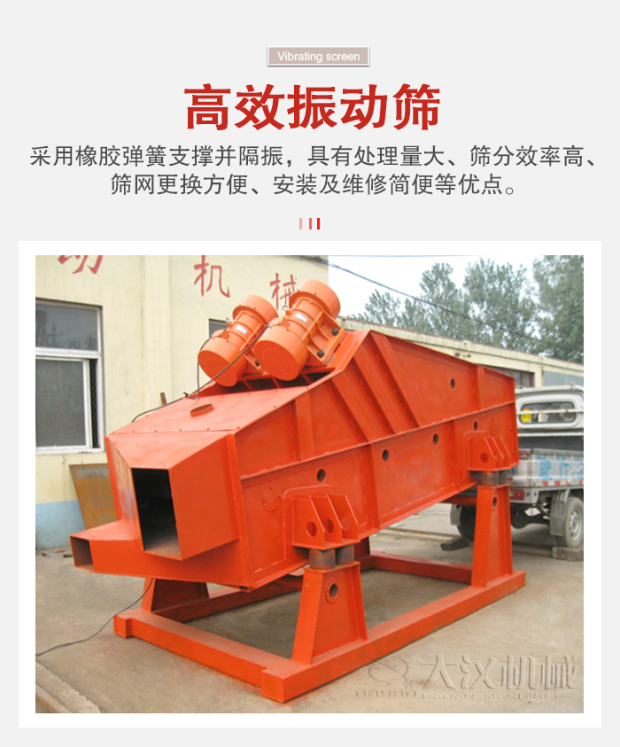 高效振動篩是利用振動電機或普通電機激振器做為振動源,使篩體沿激振力方向作周期性往復(fù)振動,物料在篩面上沿直線方向作拋物線運動,從而達(dá)到篩分目的。