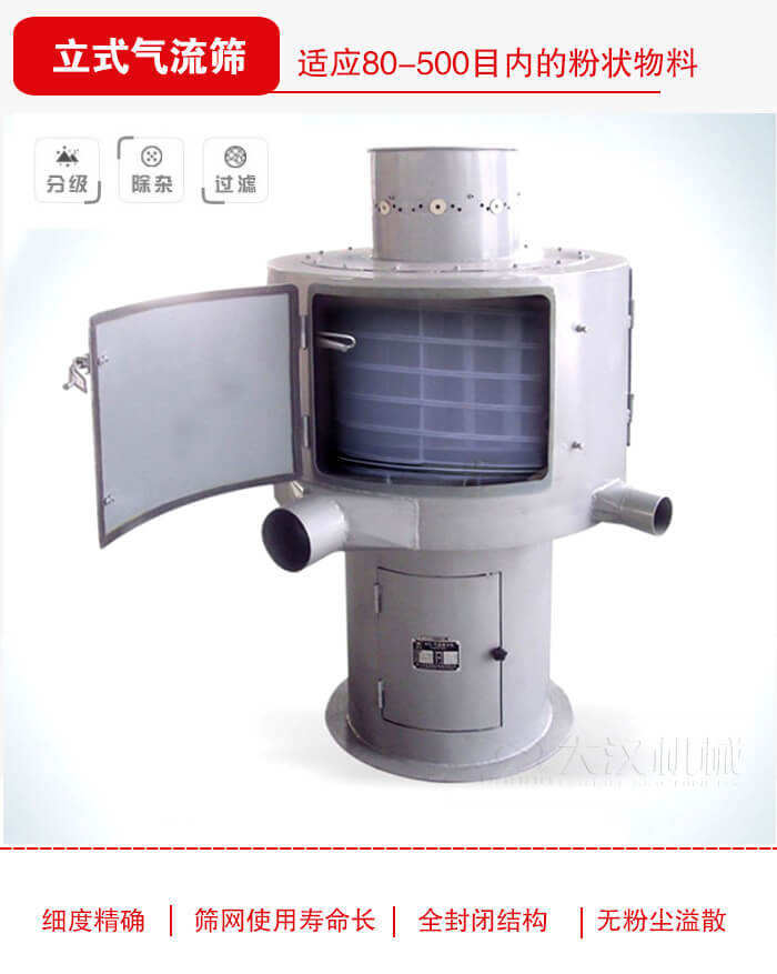 氣流篩又稱立式氣流篩主要借助風(fēng)機(jī)的風(fēng)力帶動(dòng)物料投向篩網(wǎng)從而實(shí)現(xiàn)物料的篩分,主要范圍在80-500目的粉狀物料進(jìn)行過網(wǎng),篩網(wǎng)立裝不荷重,全封閉結(jié)構(gòu),無粉塵溢散,氣流篩型號(hào)有LQS600、LQS1000、LQS1600等常規(guī)型號(hào)。